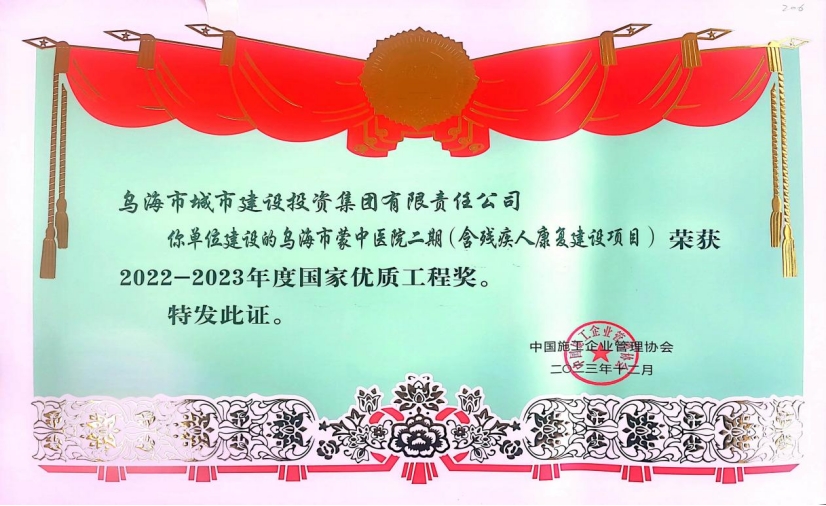 烏海市城市建設(shè)投資集團(tuán)集團(tuán)有限責(zé)任公司烏海市蒙中醫(yī)院二期(含殘疾人康復(fù)建設(shè)項(xiàng)目)榮獲“國家優(yōu)質(zhì)工程獎”