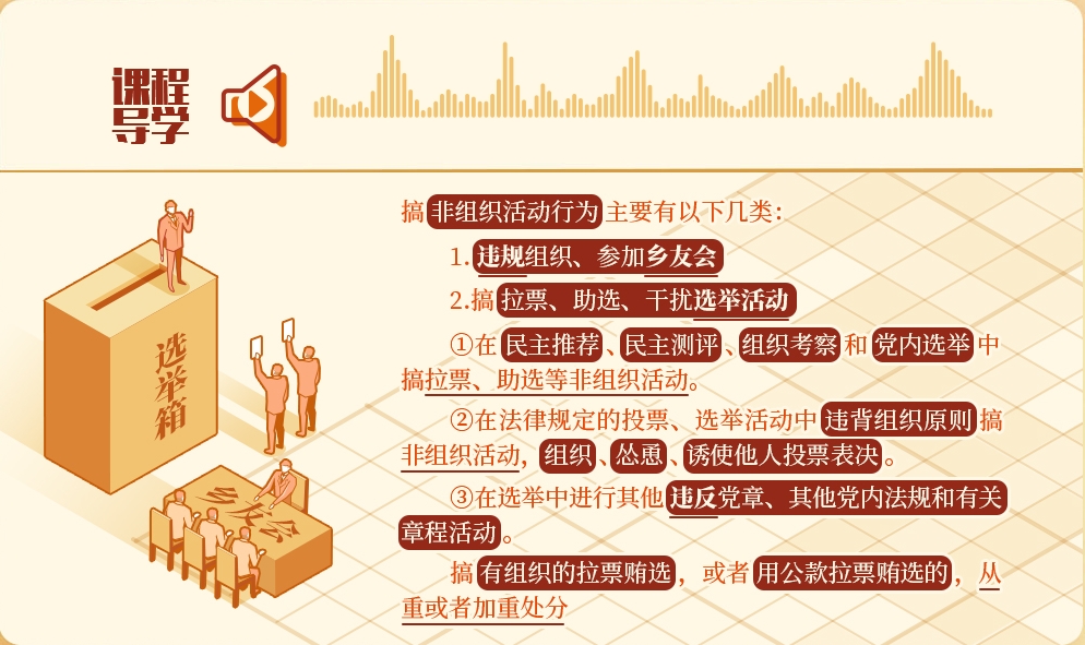 黨內(nèi)選舉是黨內(nèi)政治生活的重要組成部分?!蛾P(guān)于新形勢下黨內(nèi)政治生活的若干準(zhǔn)則》規(guī)定,黨內(nèi)選舉必須體現(xiàn)選舉人意志,堅(jiān)決防止和查處拉票賄選等行為。在選舉活動(dòng)中搞非組織活動(dòng),干擾選舉人表達(dá)選舉意愿,侵犯其他被選舉人權(quán)益,侵蝕黨內(nèi)政治文化,在黨員群眾中造成不良影響,對(duì)這類違反組織紀(jì)律的行為必須予以堅(jiān)決懲治。