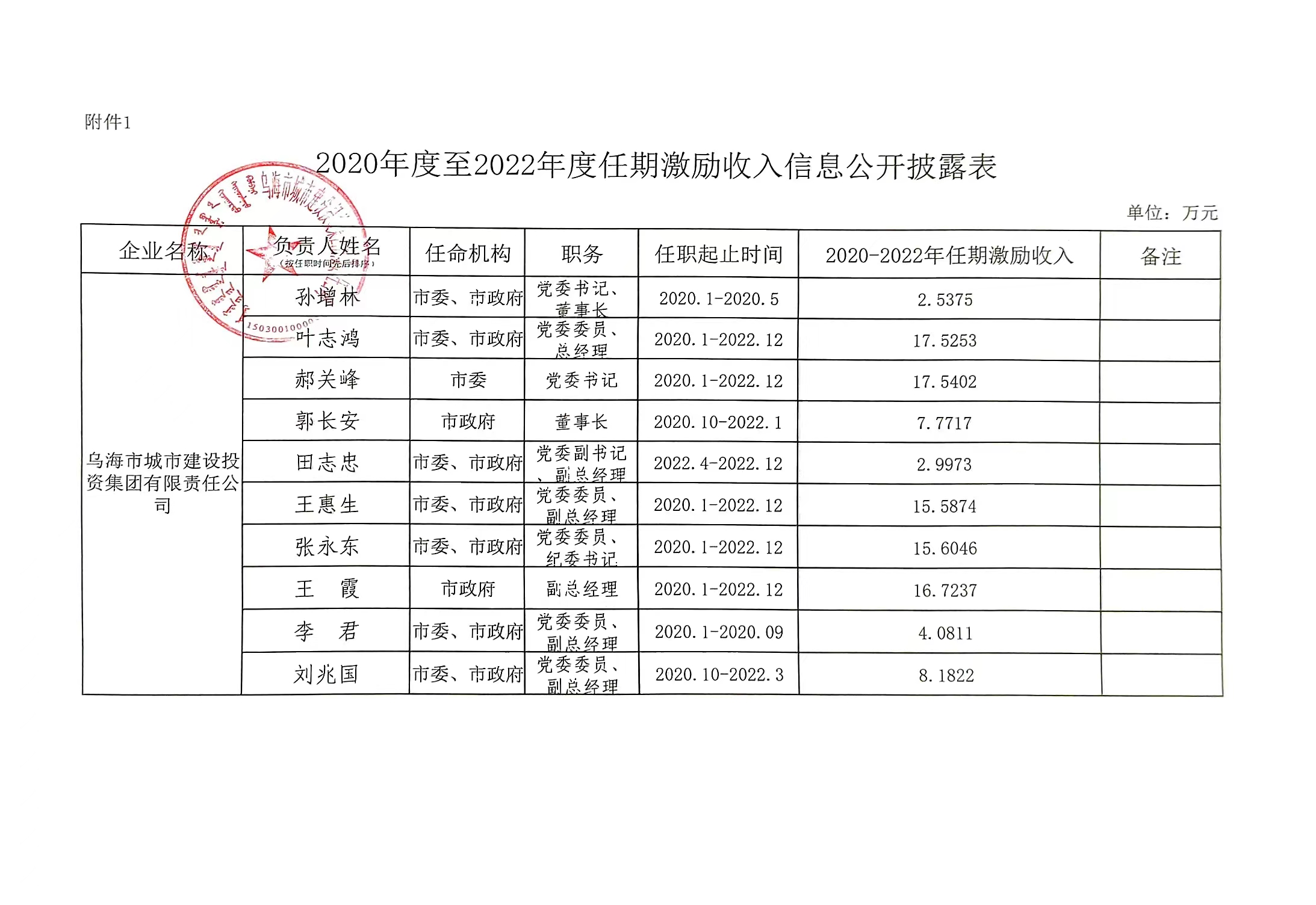 烏海市城市建設(shè)投資集團(tuán)有限責(zé)任公司企業(yè)負(fù)責(zé)人2020年度至2022年度任期激收入信息公開(kāi)披露表