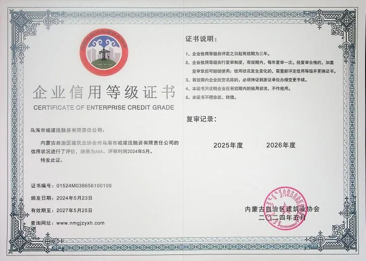 近日,經(jīng)內(nèi)蒙古自治區(qū)建筑業(yè)協(xié)會(huì)評(píng)選,烏海市城建投融資有限責(zé)任公司成功榮獲《2024年度內(nèi)蒙古自治區(qū)建筑業(yè)AAA級(jí)信用企業(yè)》稱號(hào)。此項(xiàng)殊榮的獲得,是對(duì)城建公司長期以來在建筑業(yè)領(lǐng)域誠信經(jīng)營、規(guī)范管理的充分肯定。