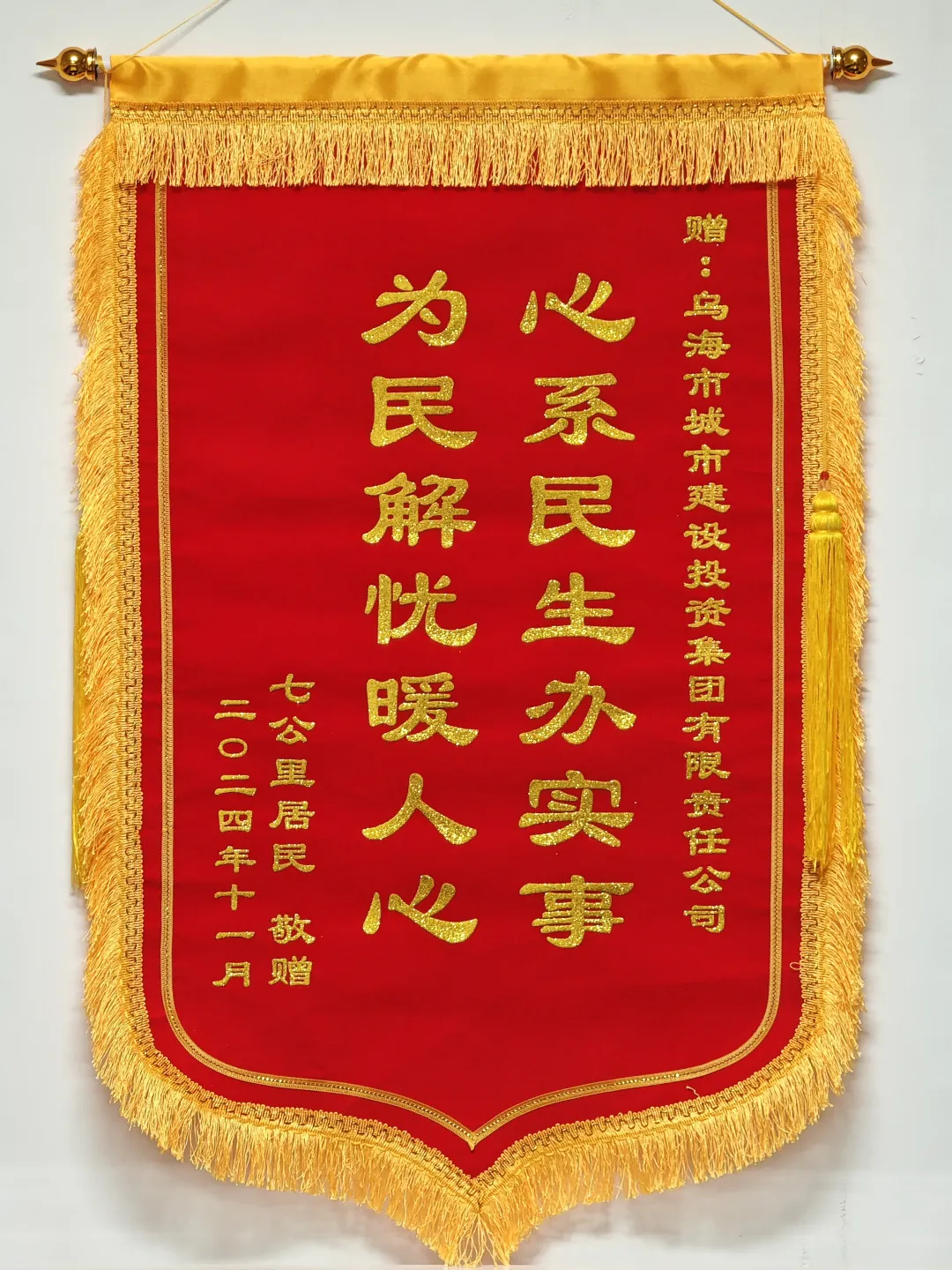 11月6日上午,烏海市城市建設(shè)投資集團(tuán)有限責(zé)任公司收到海勃灣區(qū)三廠七公里處居民送來的錦旗,錦旗上的“心系民生辦實(shí)事 為民解憂暖人心”幾個(gè)大字熠熠生輝。