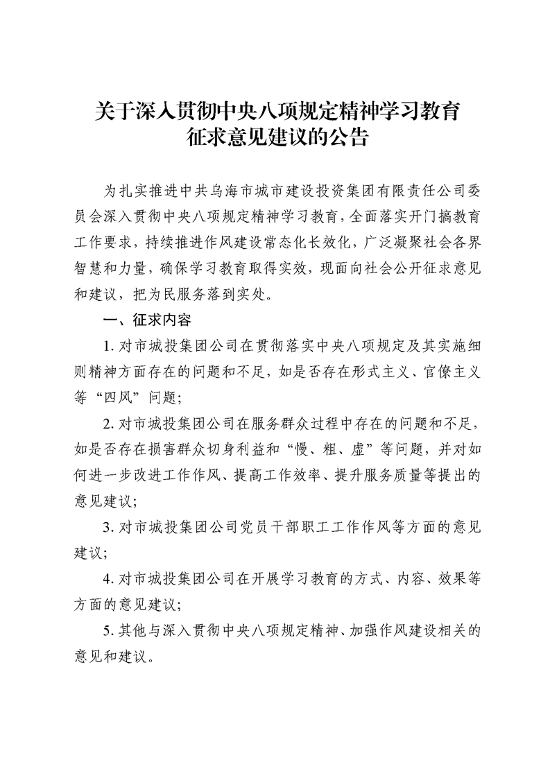 關(guān)于深入貫徹中央八項(xiàng)規(guī)定精神學(xué)習(xí)教育征求意見(jiàn)建議的公告