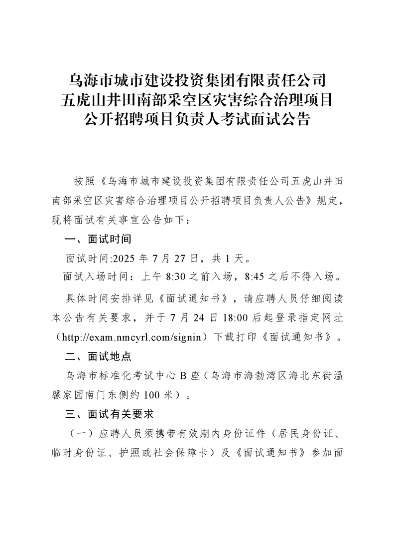 烏海市城市建設(shè)投資集團(tuán)有限責(zé)任公司五虎山井田南部采空區(qū)災(zāi)害綜合治理項(xiàng)目公開(kāi)招聘項(xiàng)目負(fù)責(zé)人考試面試公告