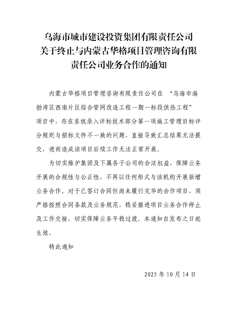 烏海市城市建設(shè)投資集團(tuán)有限責(zé)任公司關(guān)于終止與內(nèi)蒙古華格項(xiàng)目管理咨詢有限責(zé)任公司業(yè)務(wù)合作的通知