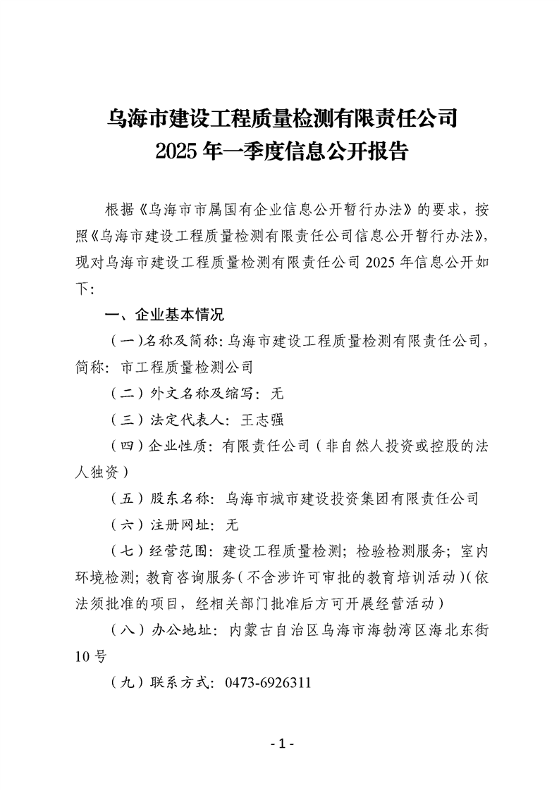 烏海市建設(shè)工程質(zhì)量檢測(cè)有限責(zé)任公司2025年一季度信息公開